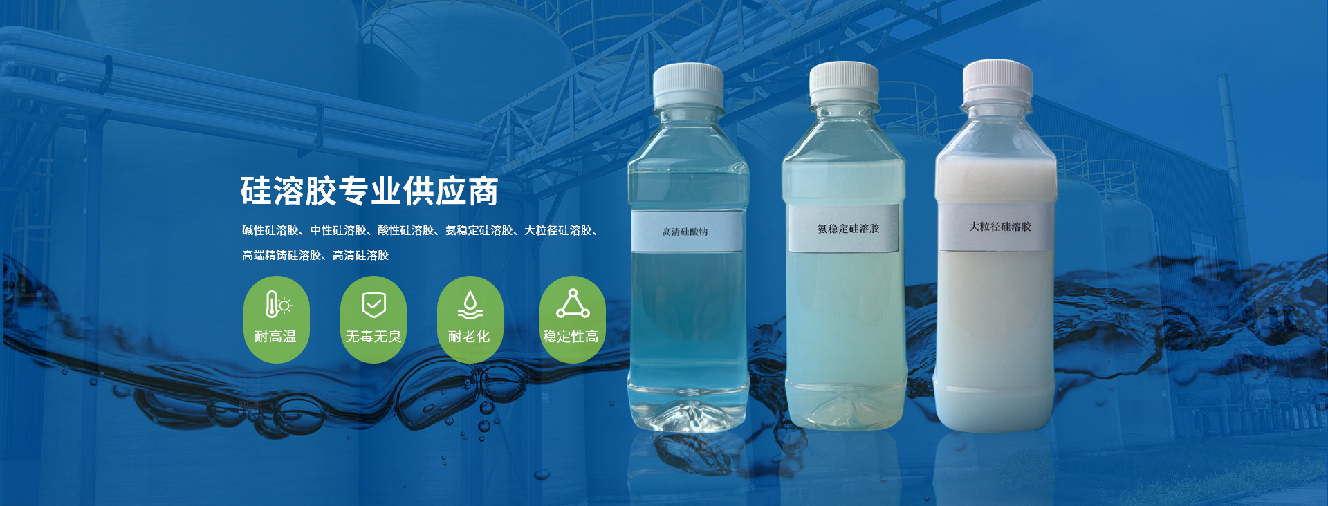 公司秉持以人为本、诚信务实、创新进取、回报社会的经营理念,不断研发新产品,满足市场需求。公司目前生产碱性硅溶胶、酸性硅溶胶、氨稳定硅溶胶、高端精铸硅溶胶、高清硅酸钠、变色硅胶、耐水硅胶、改性硅胶等多种系列产品,产品质量稳定,市场和技术成熟。广泛应用于石油和煤化工催化剂、吸附剂、纺织、蓄电池、电子抛光、无机涂料、精密铸造与耐火材料等行业。